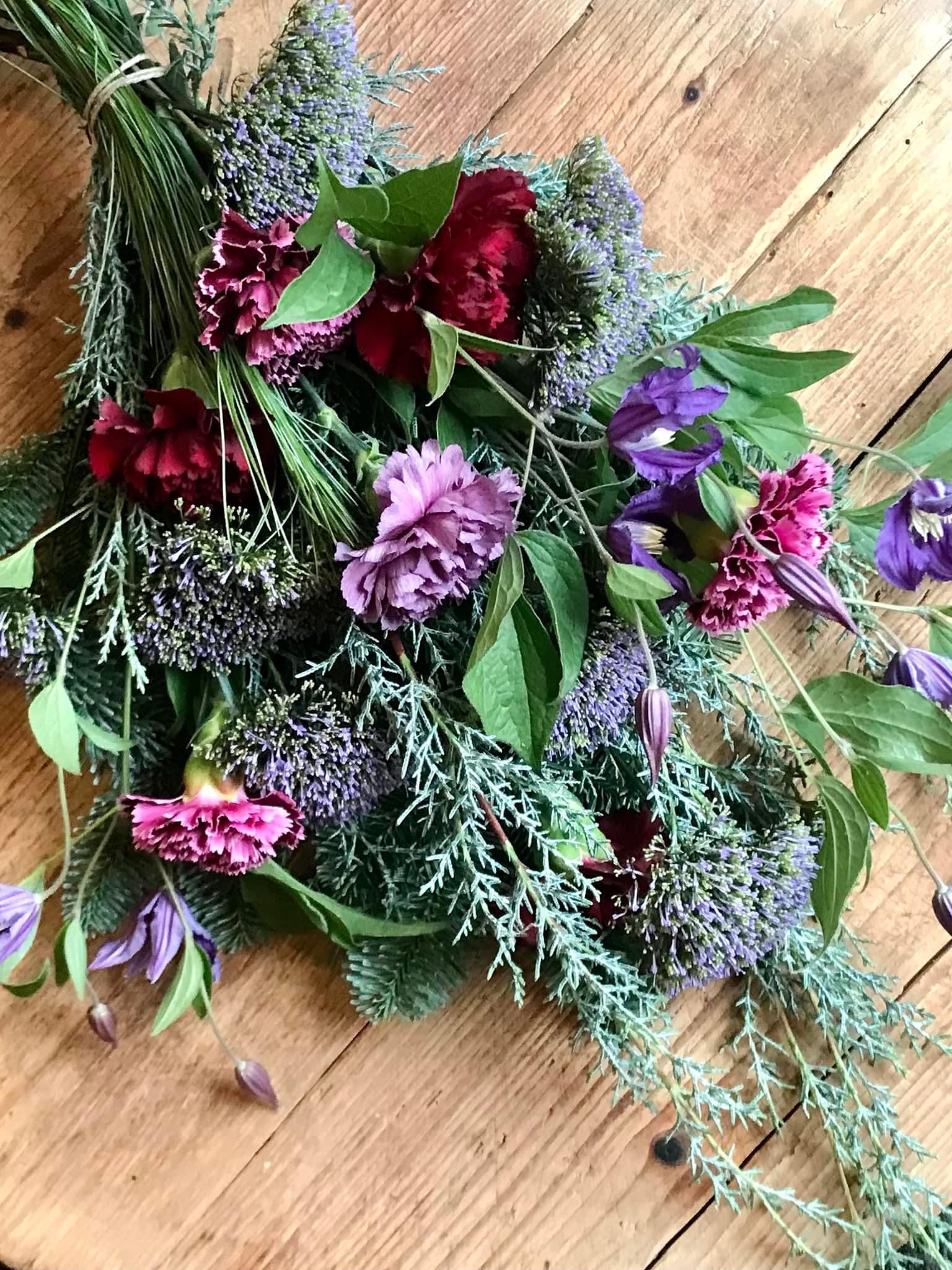Bårebuket i smukke mørke nuancer. Blomster og grønt varierer efter årstiden.