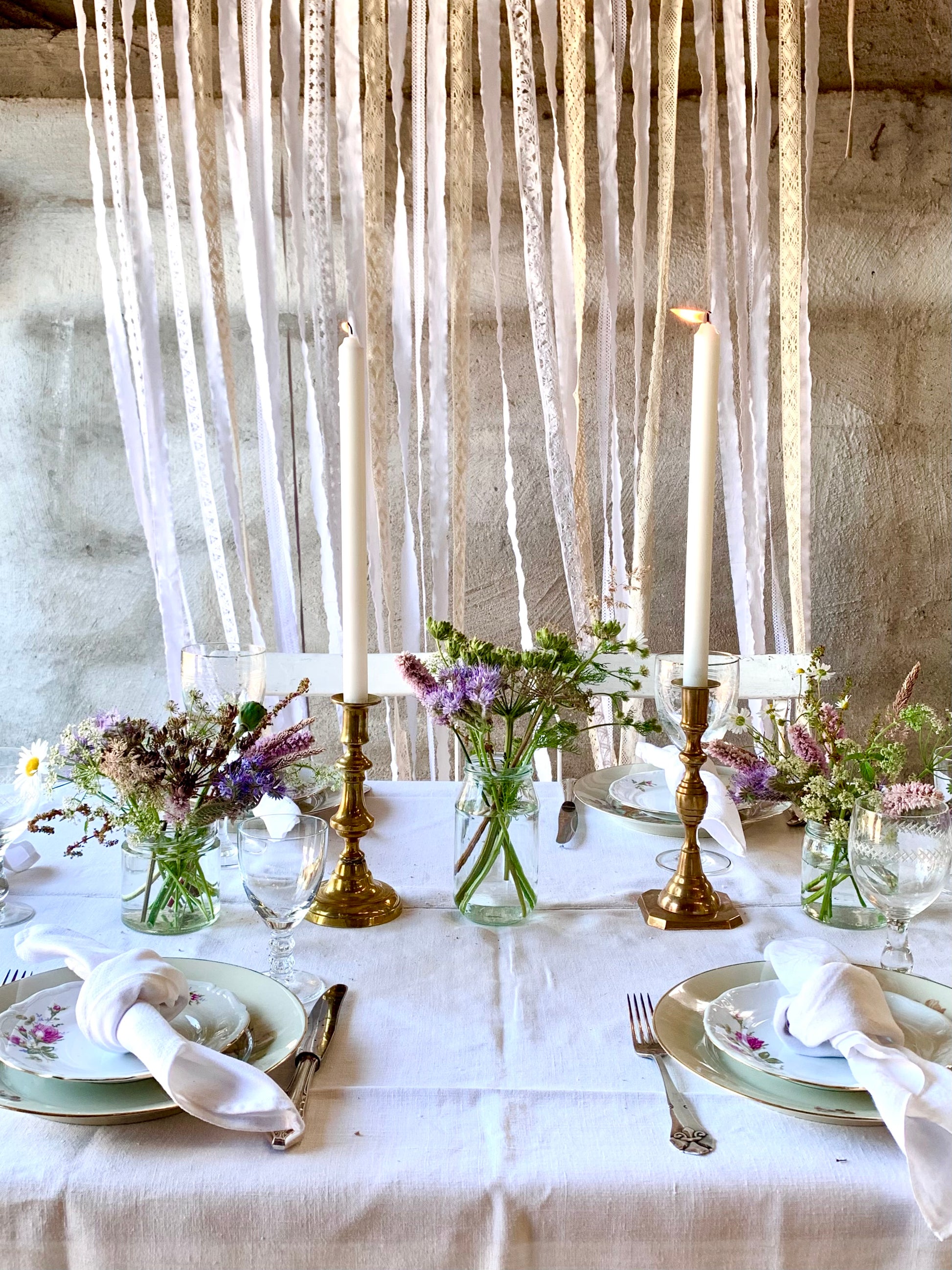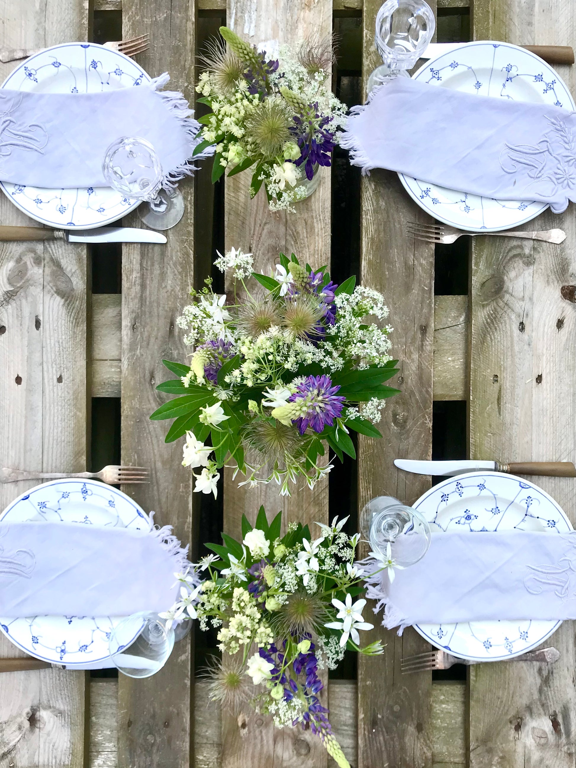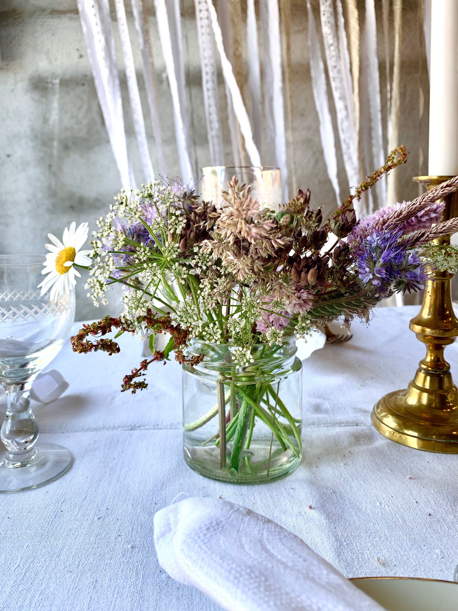 Blomster fra haven og naturen i afstemte farver i forskellige konservesglas. Der er 6-12 stilke i hvert glas. Med disse fine og lette buketter, skaber du nemt en let og uhøjtidelig stemning til brylluppet eller festen. Vi anbefaler 1 buket for hver 2 gæster, for at det perfekte udtryk. Vi er i dialog med dig omkring blomster og farvenuancer.
