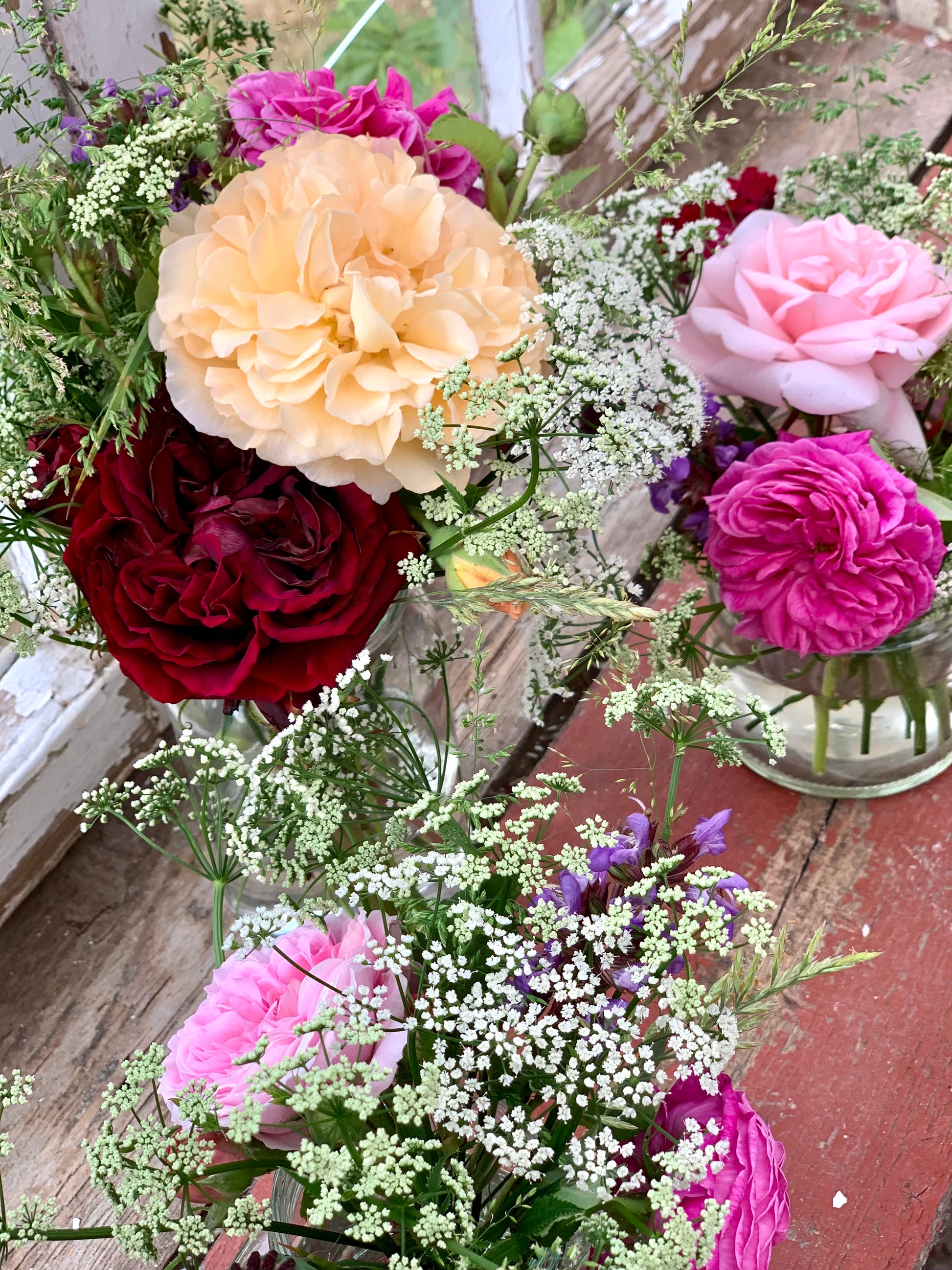 Blomster fra haven og naturen i bohemefarver i stort konservesglas. Der er 12-20 stilke i hvert glas. Med disse skønne buketter, skaber du nemt en let og uhøjtidelig stemning til brylluppet eller festen. Vi anbefaler 1 buket for hver 2 af de almindelige konservesglas med blomster for at give højde og fylde. Vi er i dialog med dig omkring blomster og farvenuancer.
