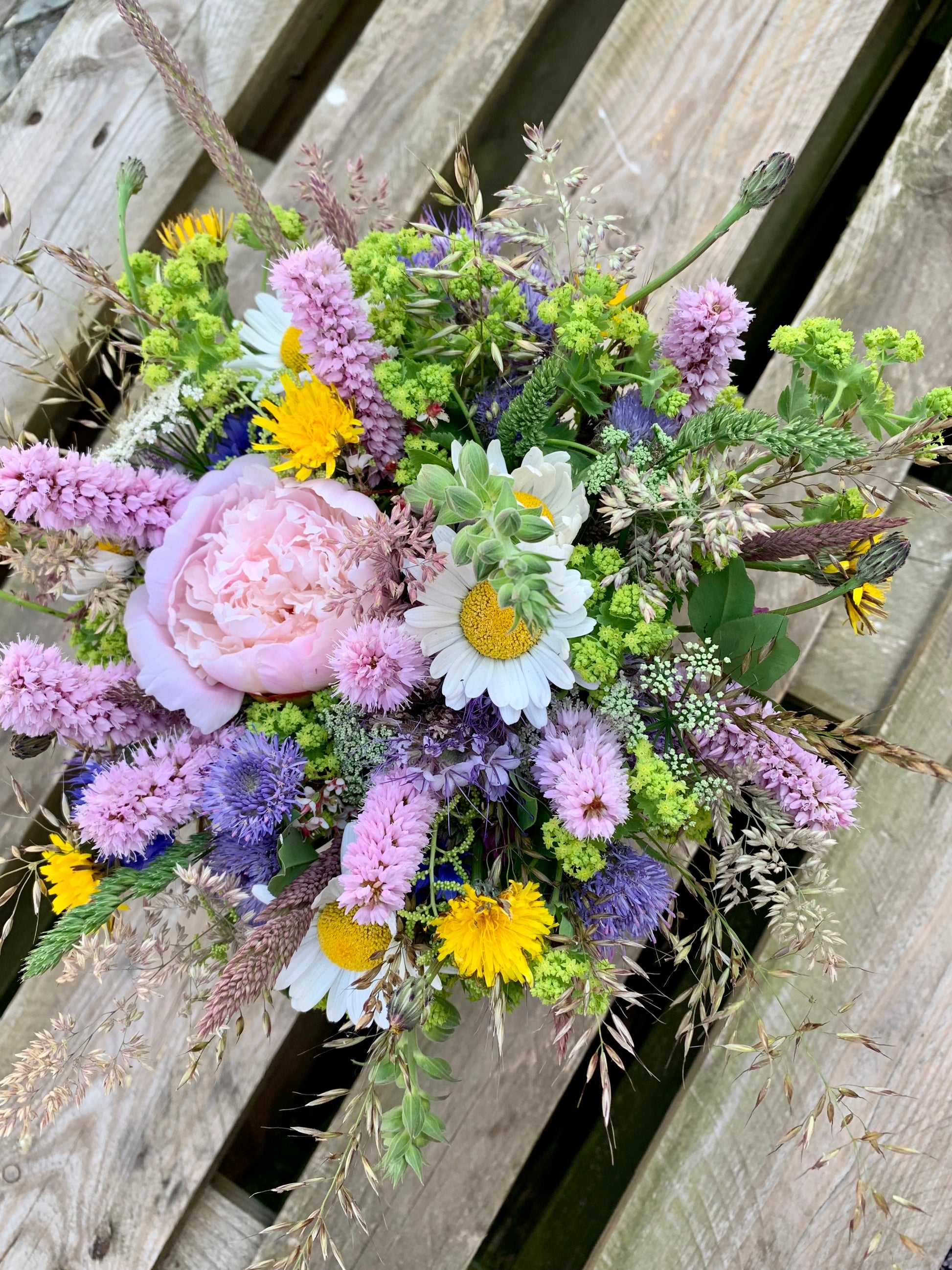 Brudebuket bundet med de sommerglade blomster haven og naturen byder på lige nu.