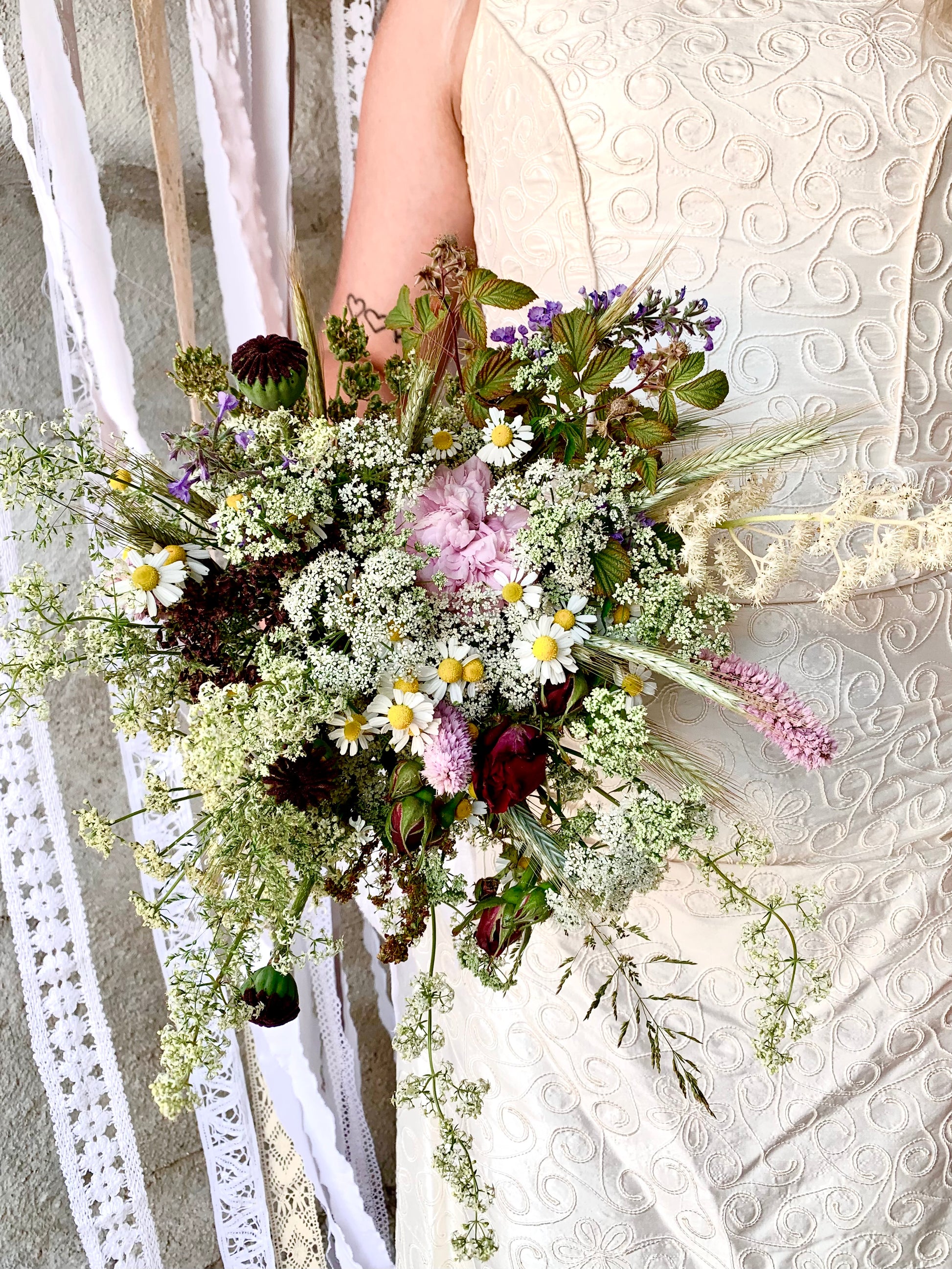 Brudebuket i hvide og støvede farver. Den er bundet med en god blanding af, hvad haven og naturen byder på lige nu.