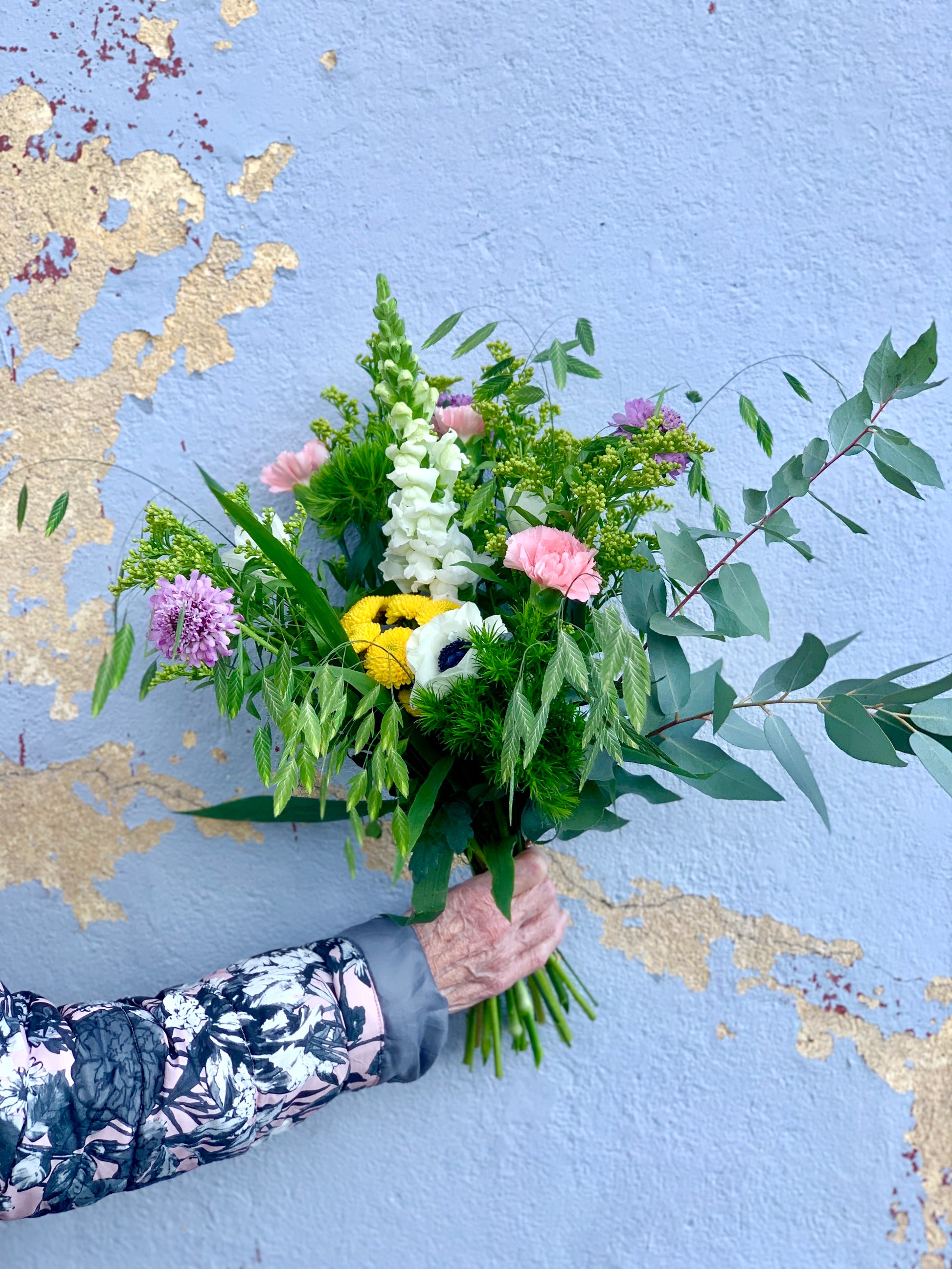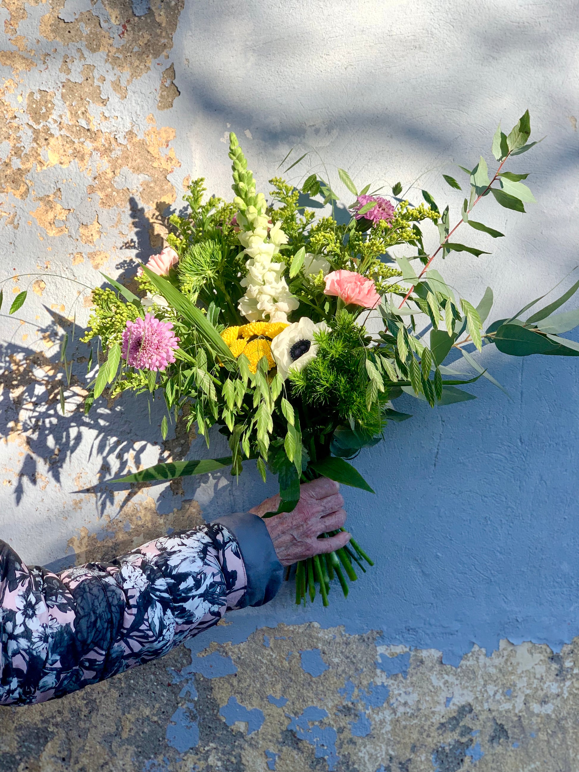 Skøn og samtidig let buket med glade farver. Buketten vil variere efter årstidens blomster.