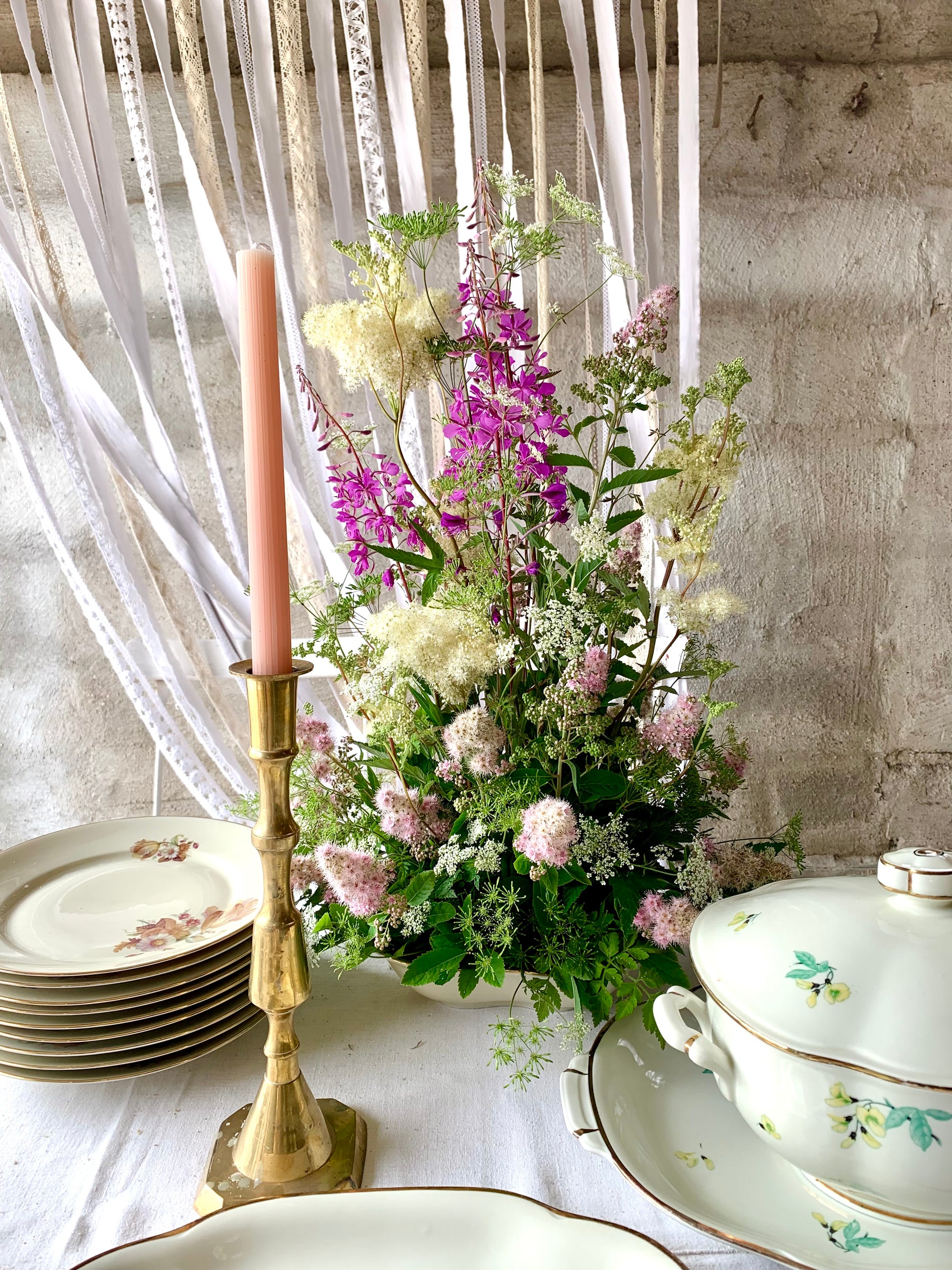 Skøn dekoration lavet af grøftekantsblomster. Vi laver den efter farveønsker, og hvad grøftekanten byder på lige før du skal bruge den. Dekorationen kan også laves bred i stedet for høj, hvis det ønskes. Den kan bruges på runde eller kvadratiske borde, buffet, gavebord, på gulvet eller i baren.