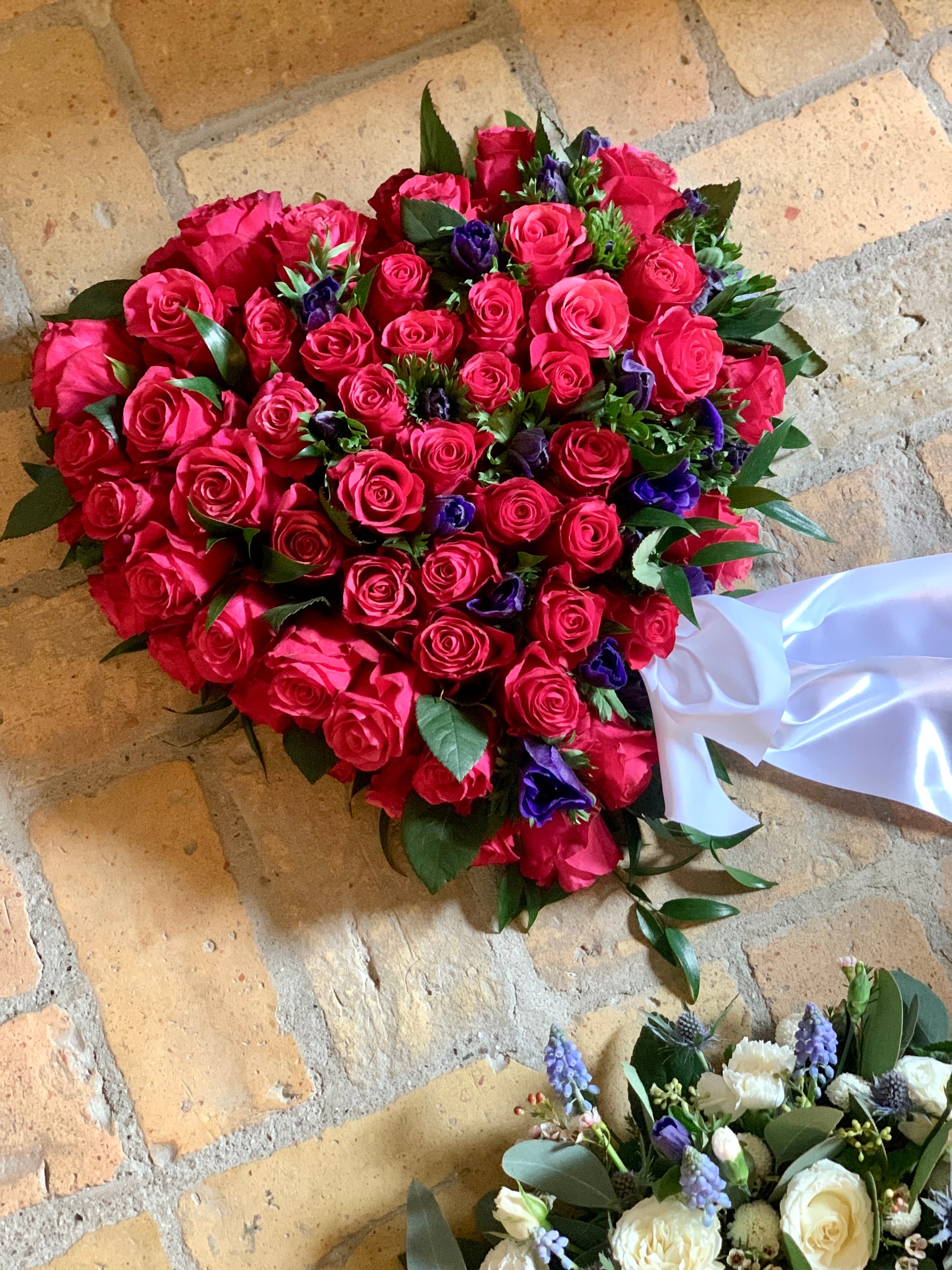 Hjerte med røde røser, grønt og anden blomst. Her har vi brugt franske anemoner. Diameter 45 cm.
