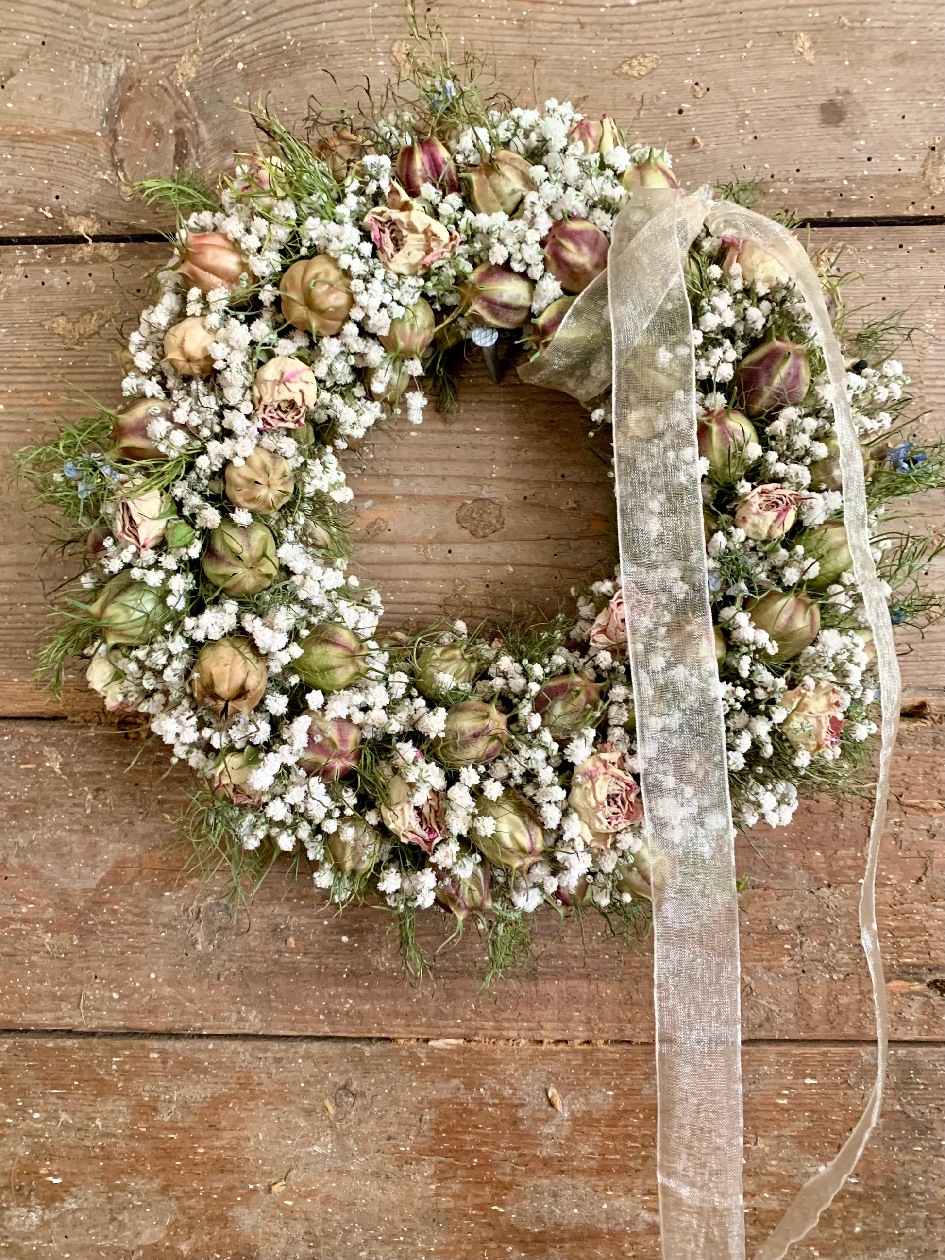 Skøn krans med evighedsblomster og fint cremefarvet bånd. Diameter cirka 20 cm.