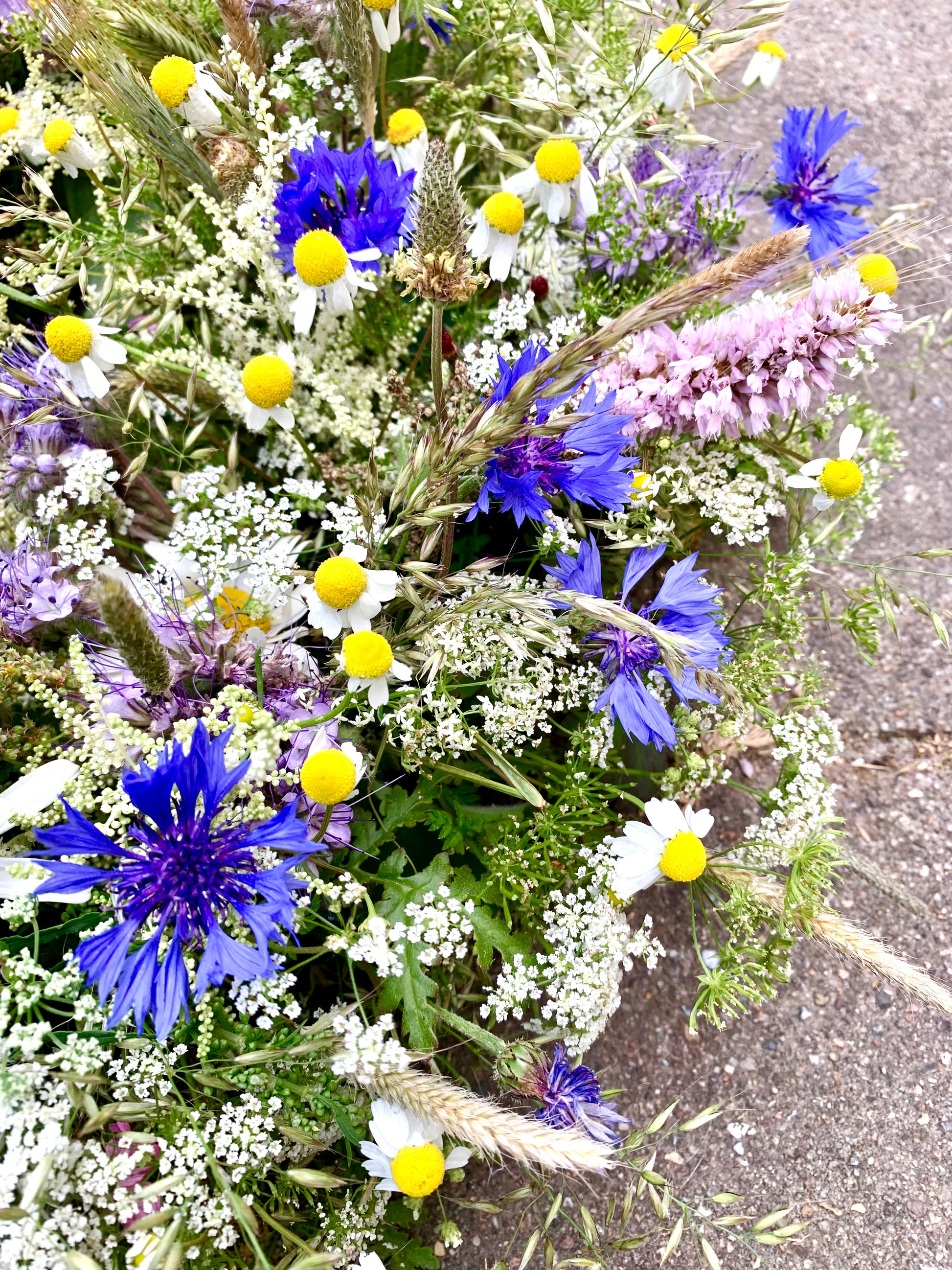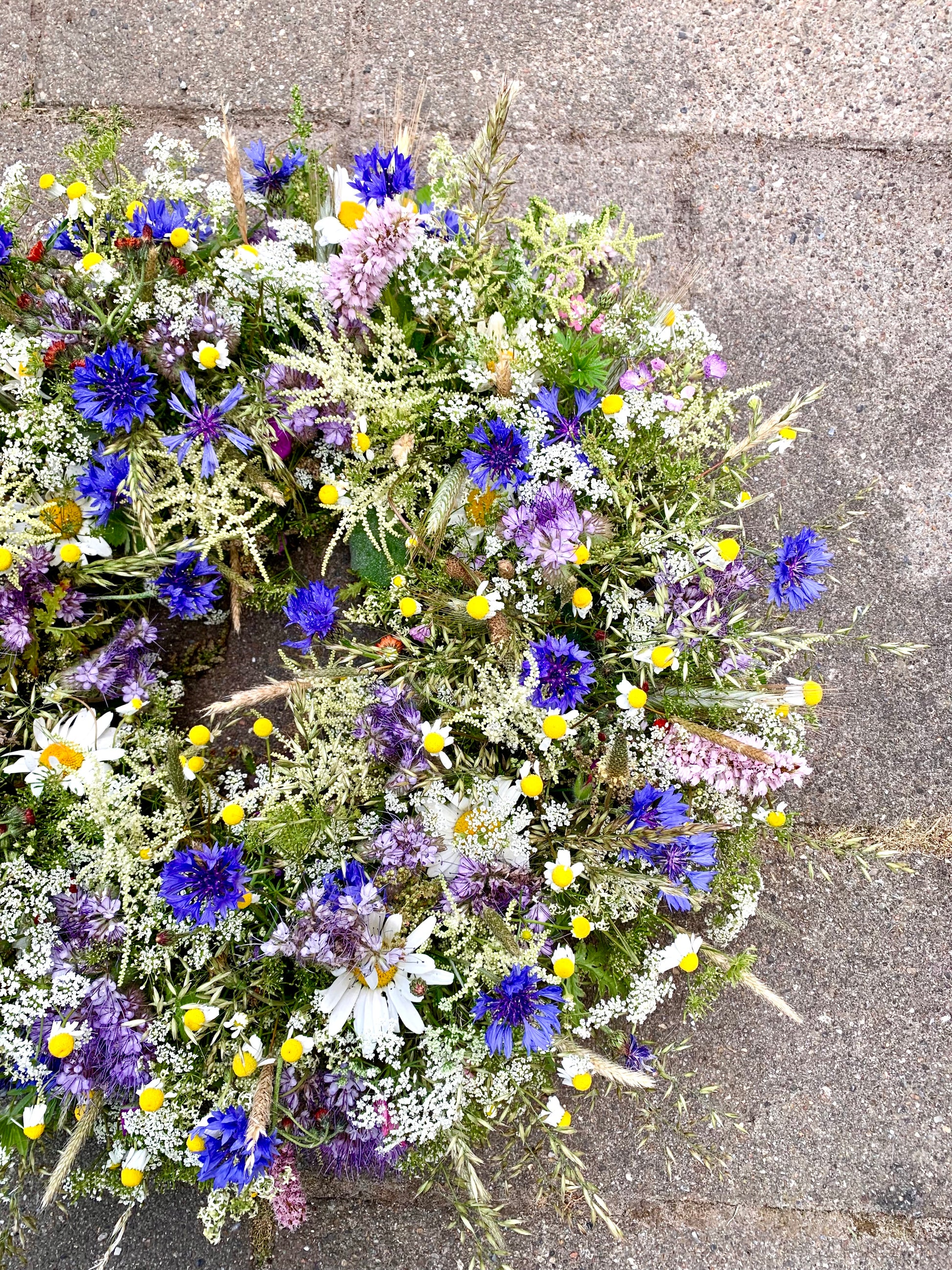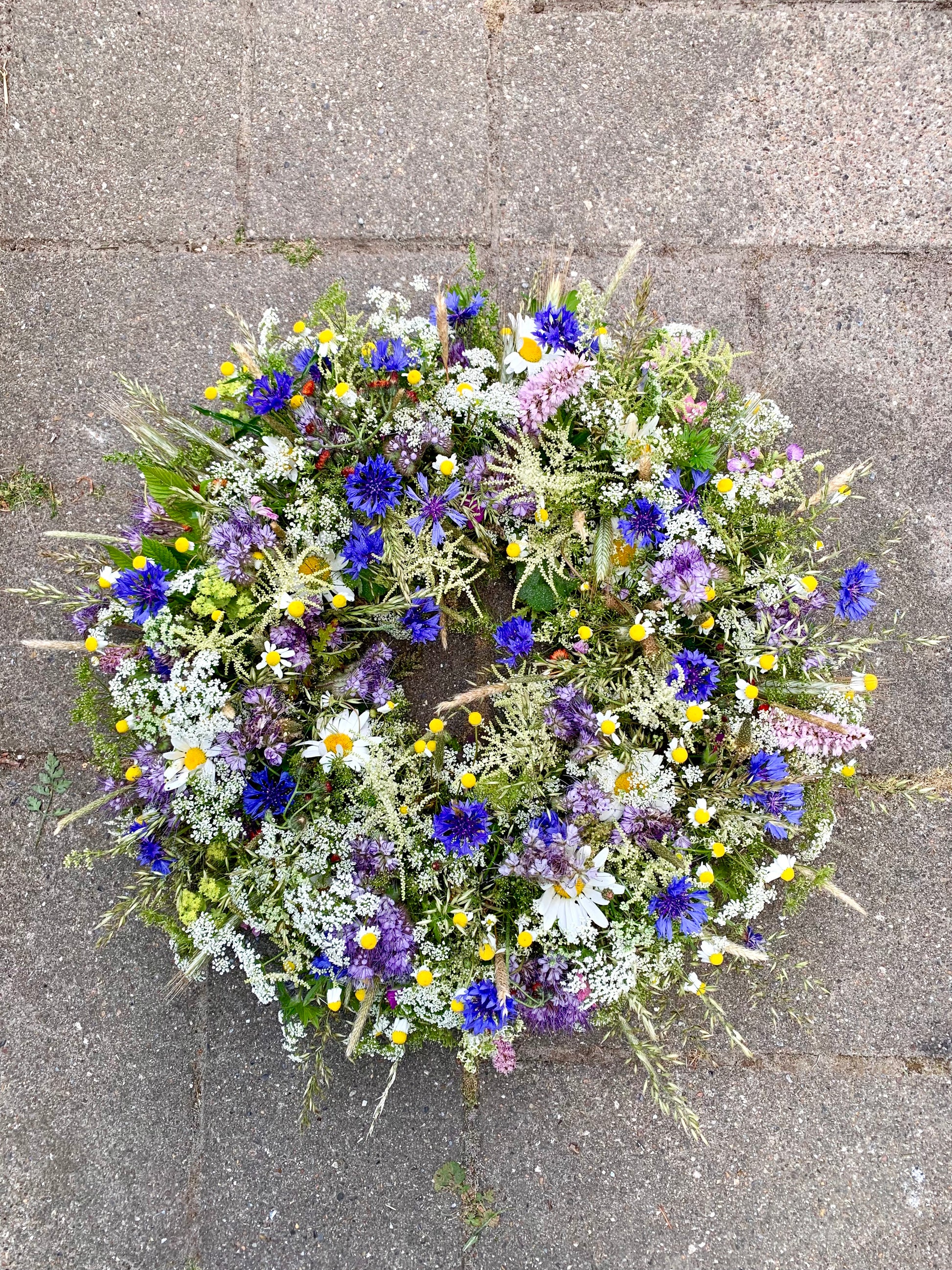 Rundpyntet krans med grøftekantsblomster. Vi laver den kun i sommerhalvåret. Vi laver den i den/de farve/farver du ønsker. Diameter 60 cm.