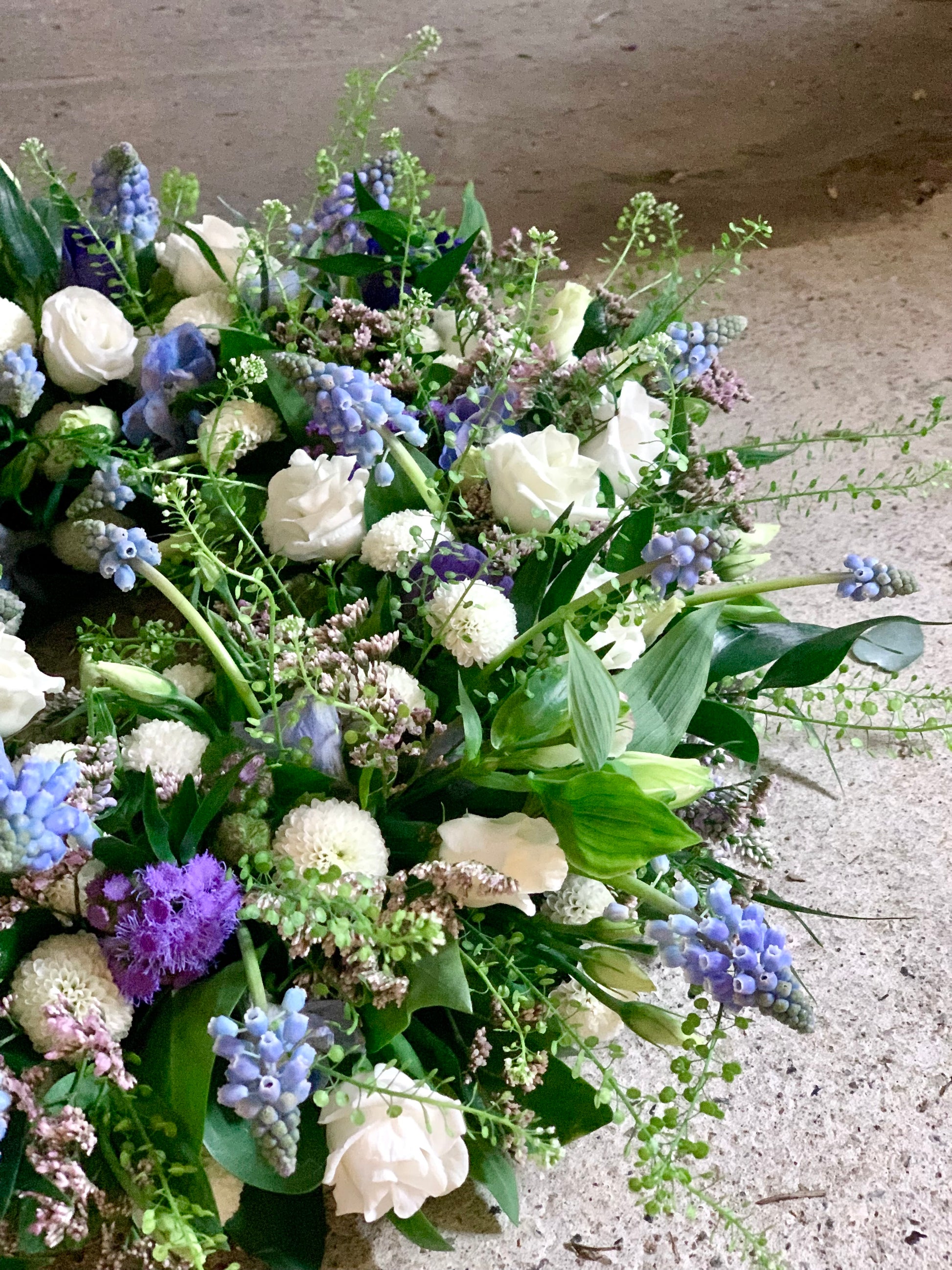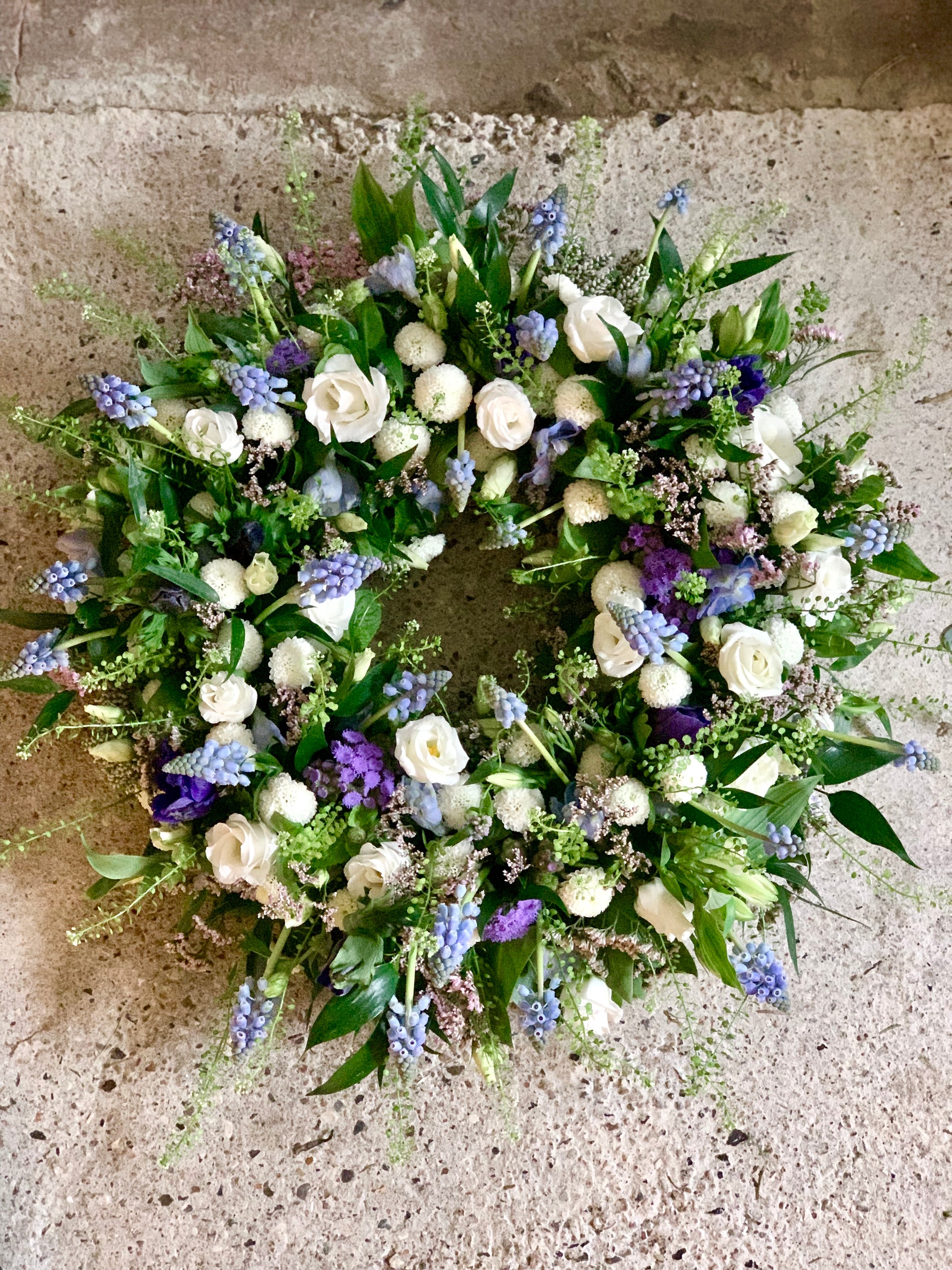 Lys og let rundpyntet krans med årstidens blomster. Vi laver den i den/de farve/farver du ønsker. Diameter 45 cm.