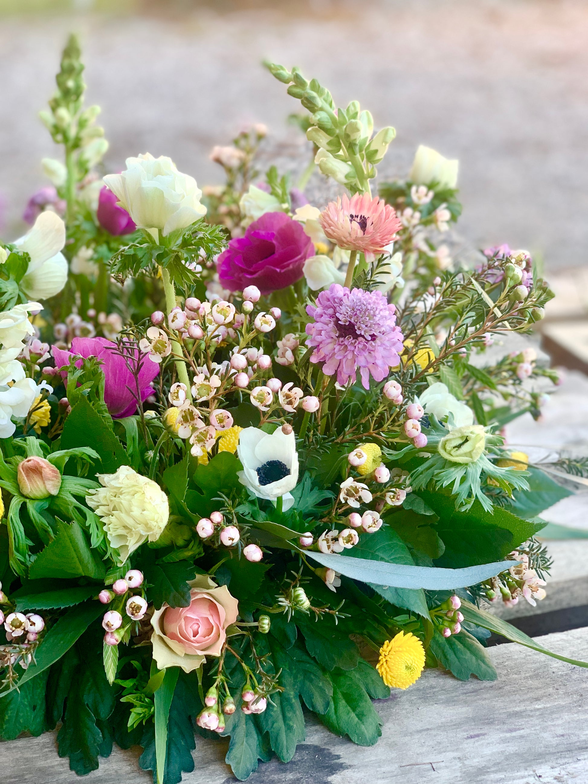 Blomstereng er en rundpyntet krans, hvor hele kransen er dækket med blomster og grønt i afstemte farver. Herfra kommer blomster op i varierende højder. Diameter cirka 45 cm.