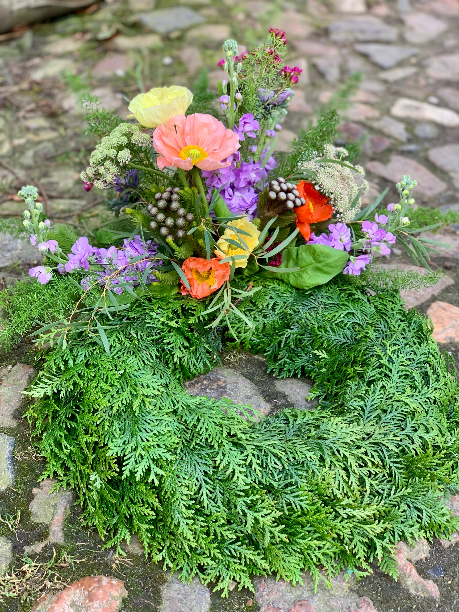 Blomstereng er en sidepyntet krans. Kransen er bundet med thuja, og har et smukt blomsterengsarrangement i den ene side, hvor hele kransen er dækket med blomster og grønt i afstemte farver. Herfra kommer blomster op i varierende højder. Diameter cirka 45 cm.